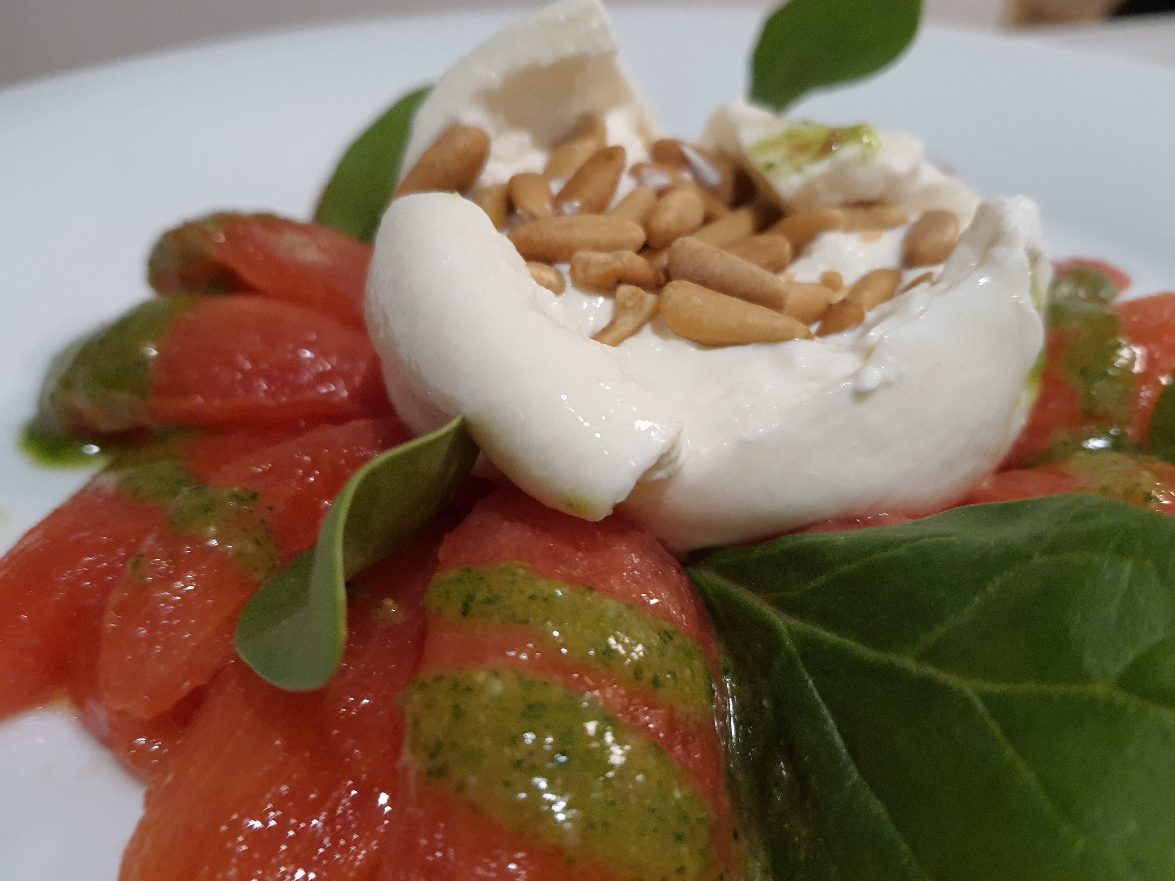 Tomate confitado, stracciatella de piñones y pesto de espinacas