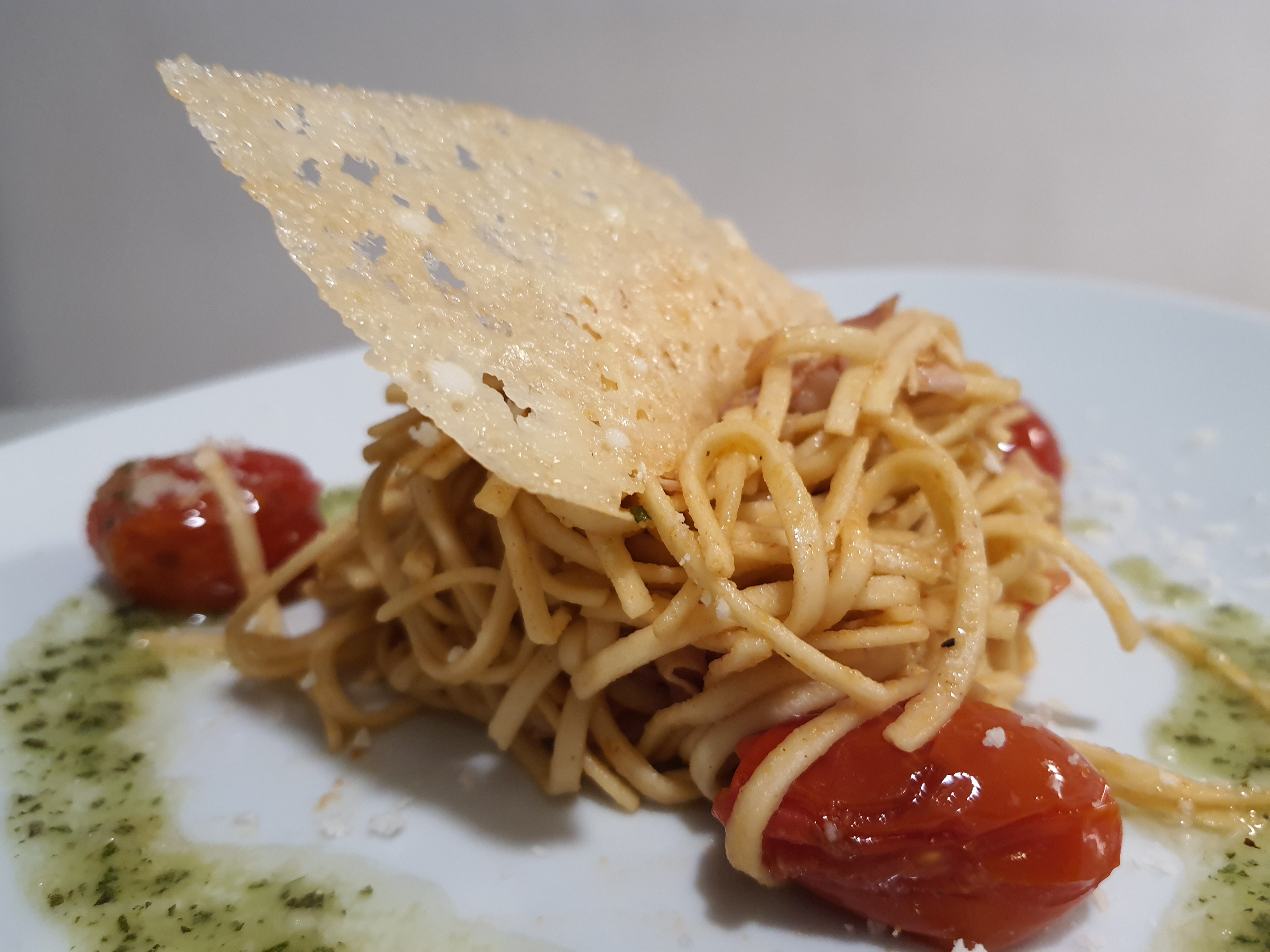 Noodles salteados con speck, cherrys, parmesano y albahaca