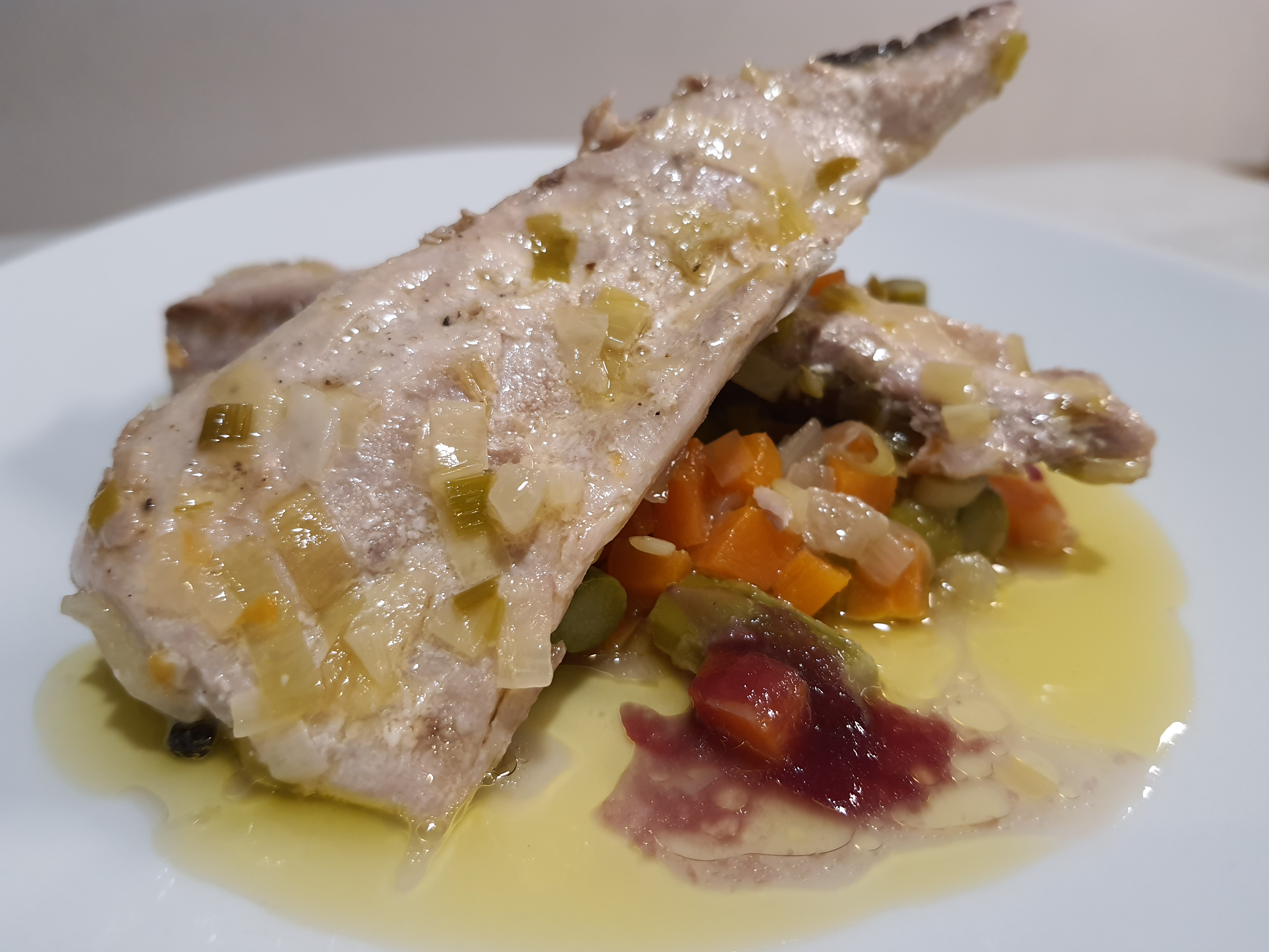 Bonito con salteado de verduras, ajos tiernos y garnacha