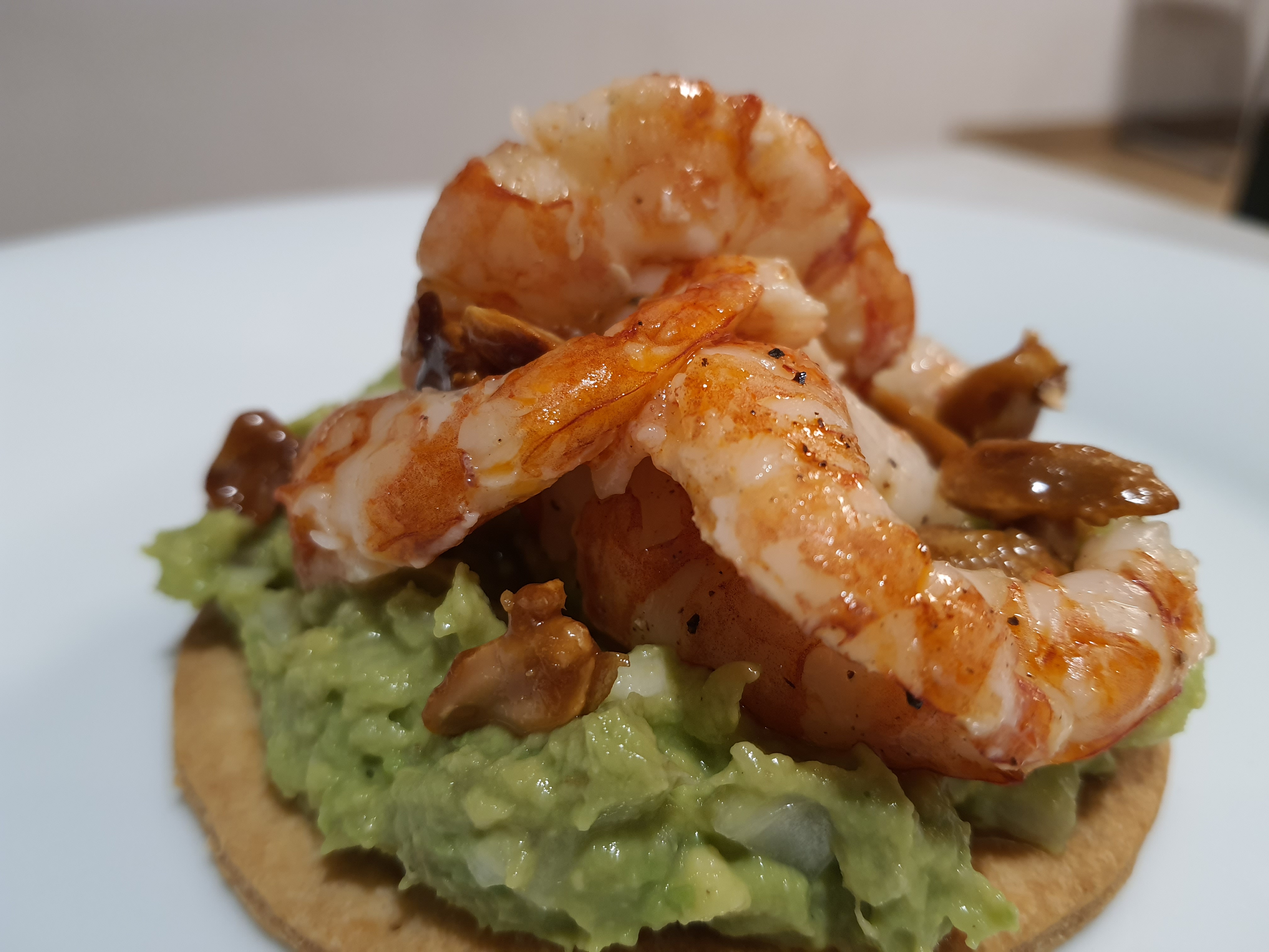 Coca de gambas, aguacate y cacahuete garrapiñado