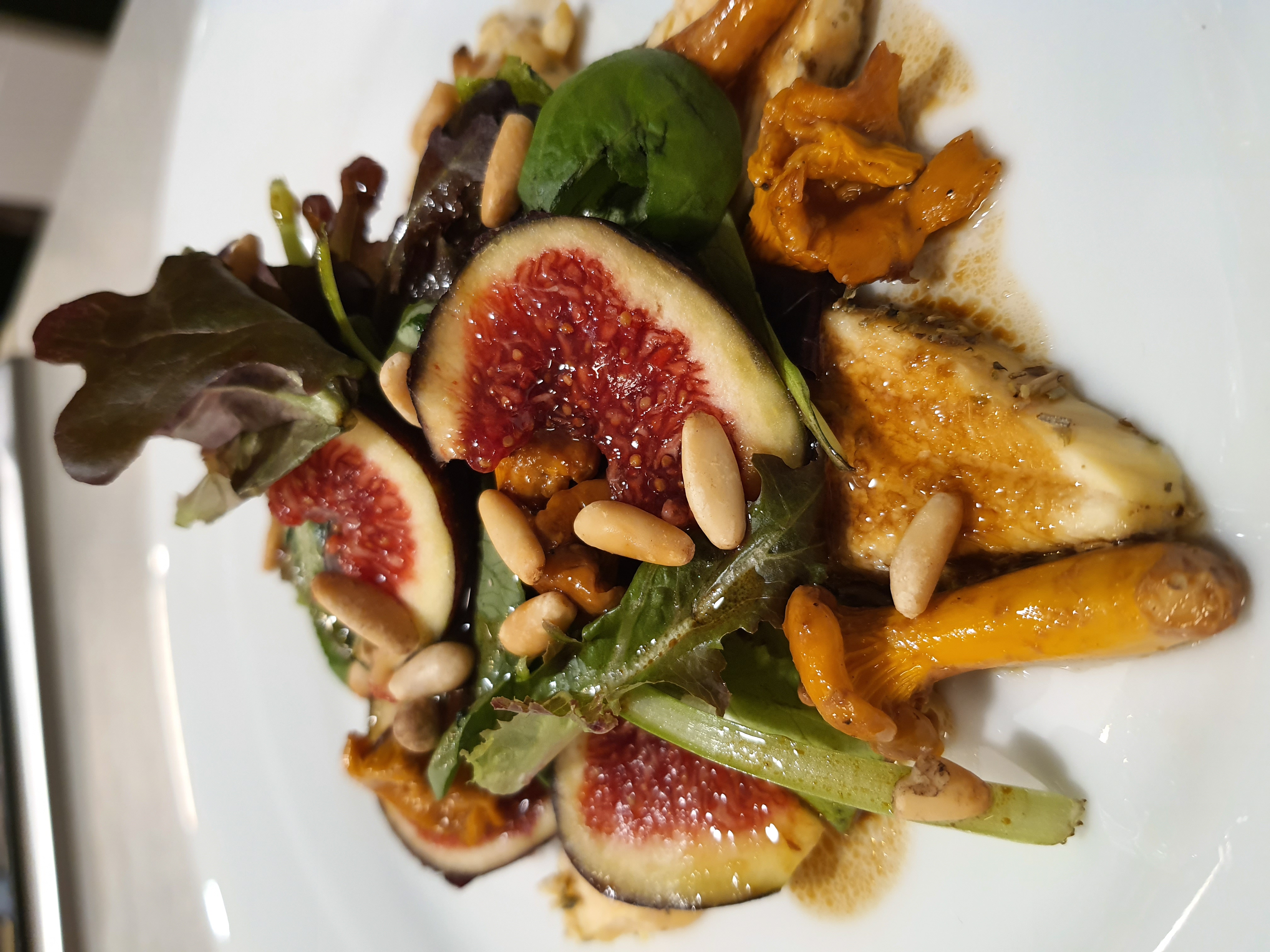 Ensalada tibia de rebozuelos con pollo a las hierbas y vinagreta de higos