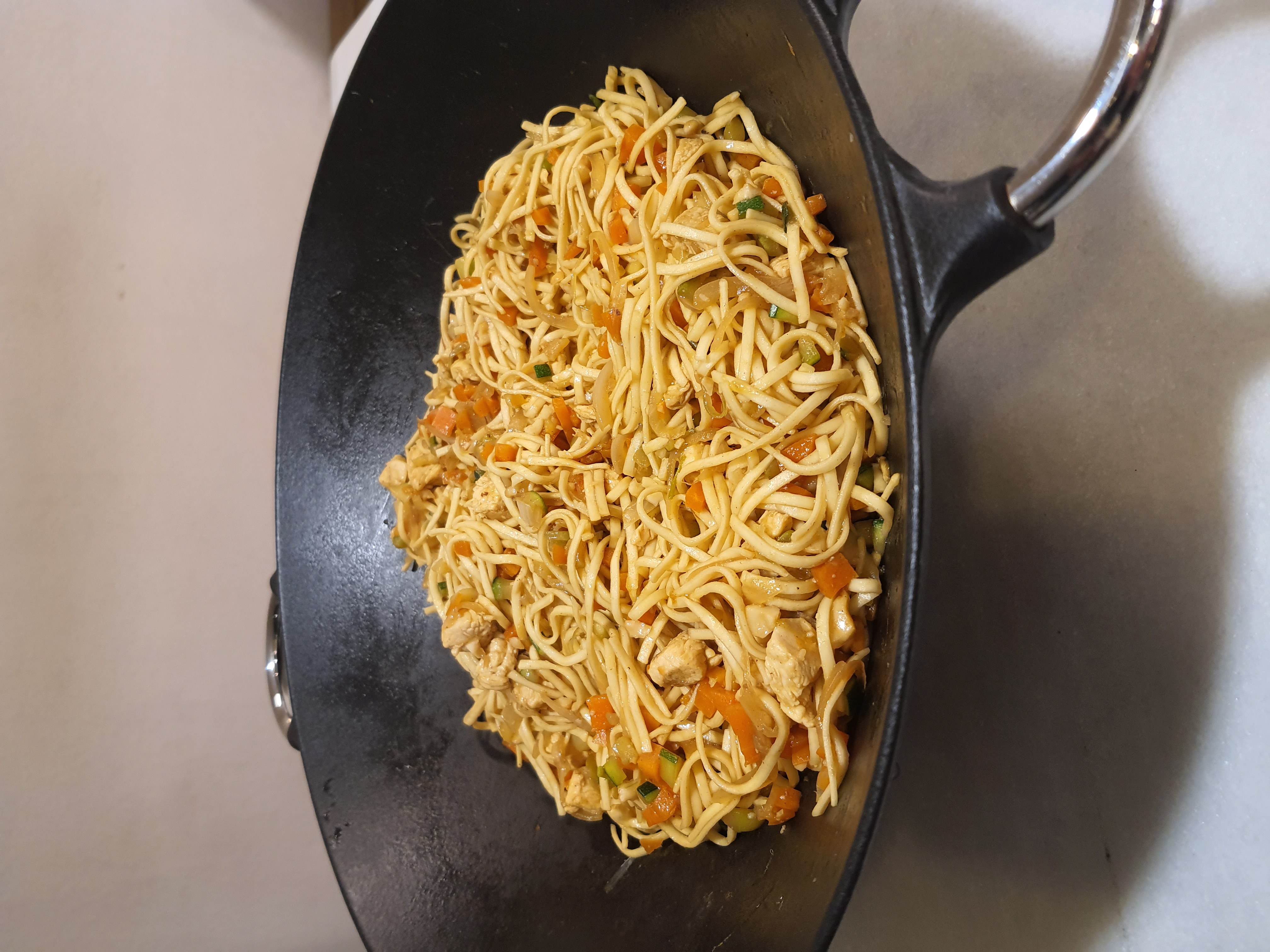 Wok de fideos, pollo y verduras