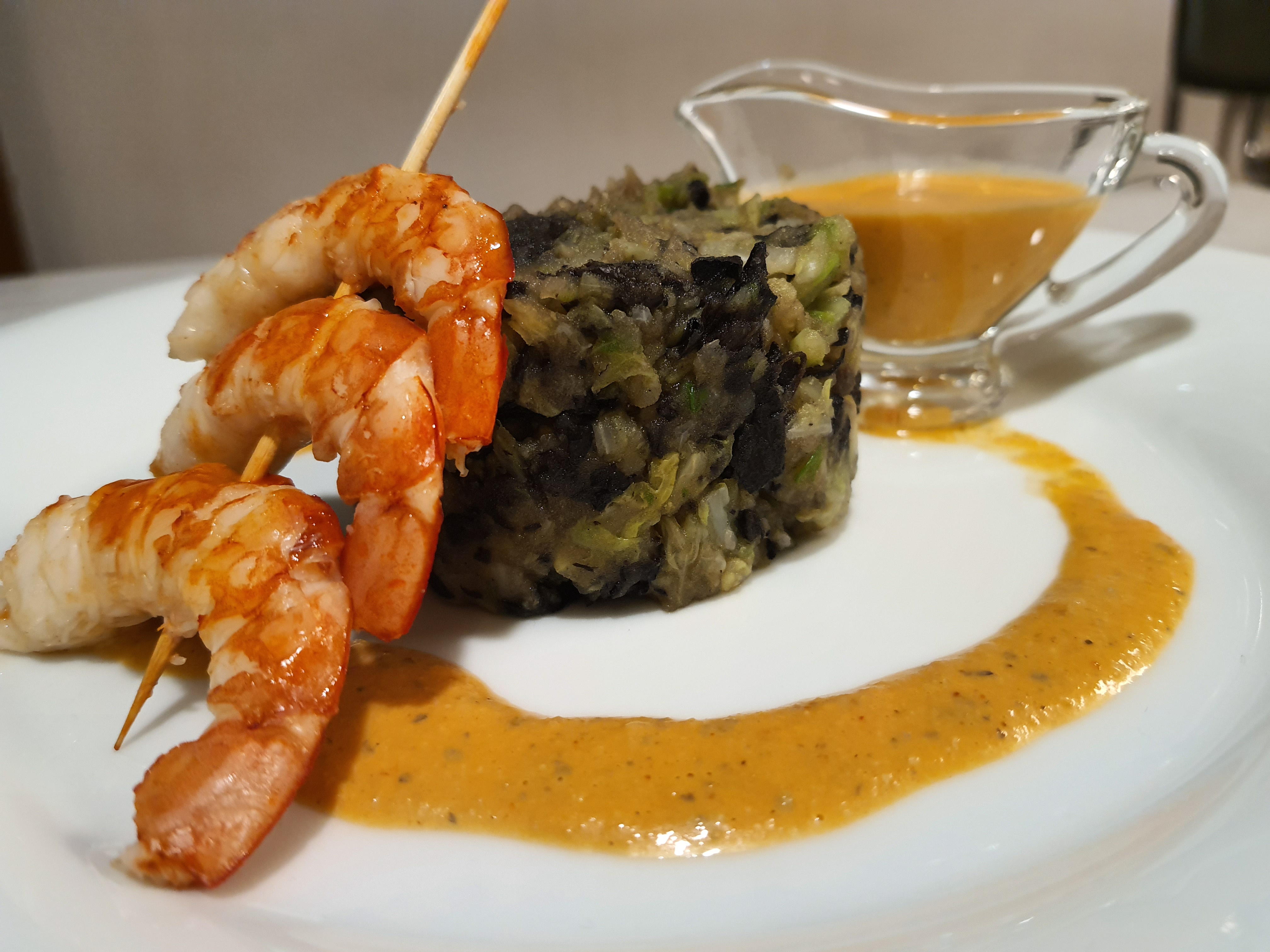 "Trinxat" de col y patata con trompetas, gambas y romesco de pipas