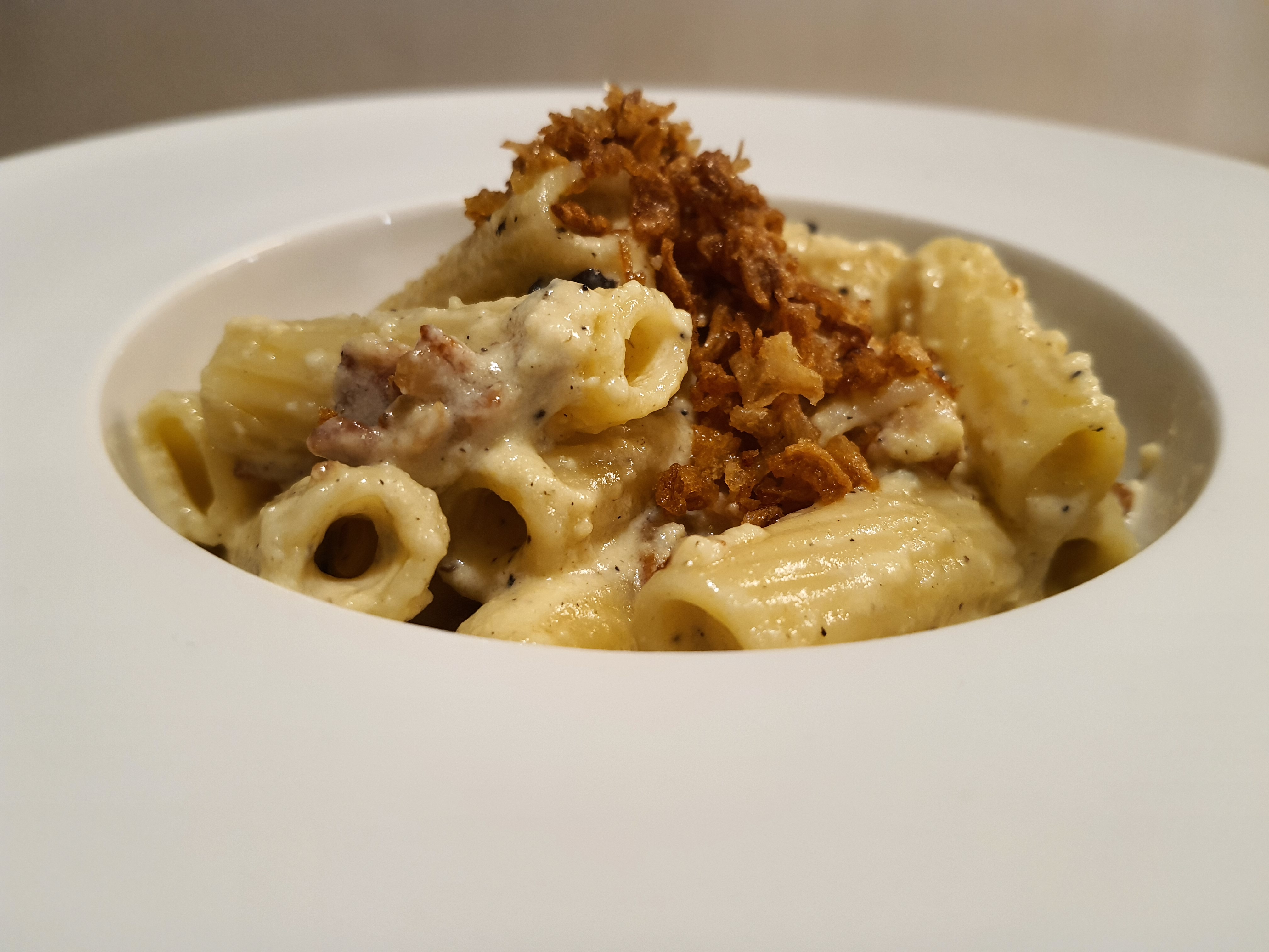 Rigatoni a la carbonara trufada con cebolla crujiente