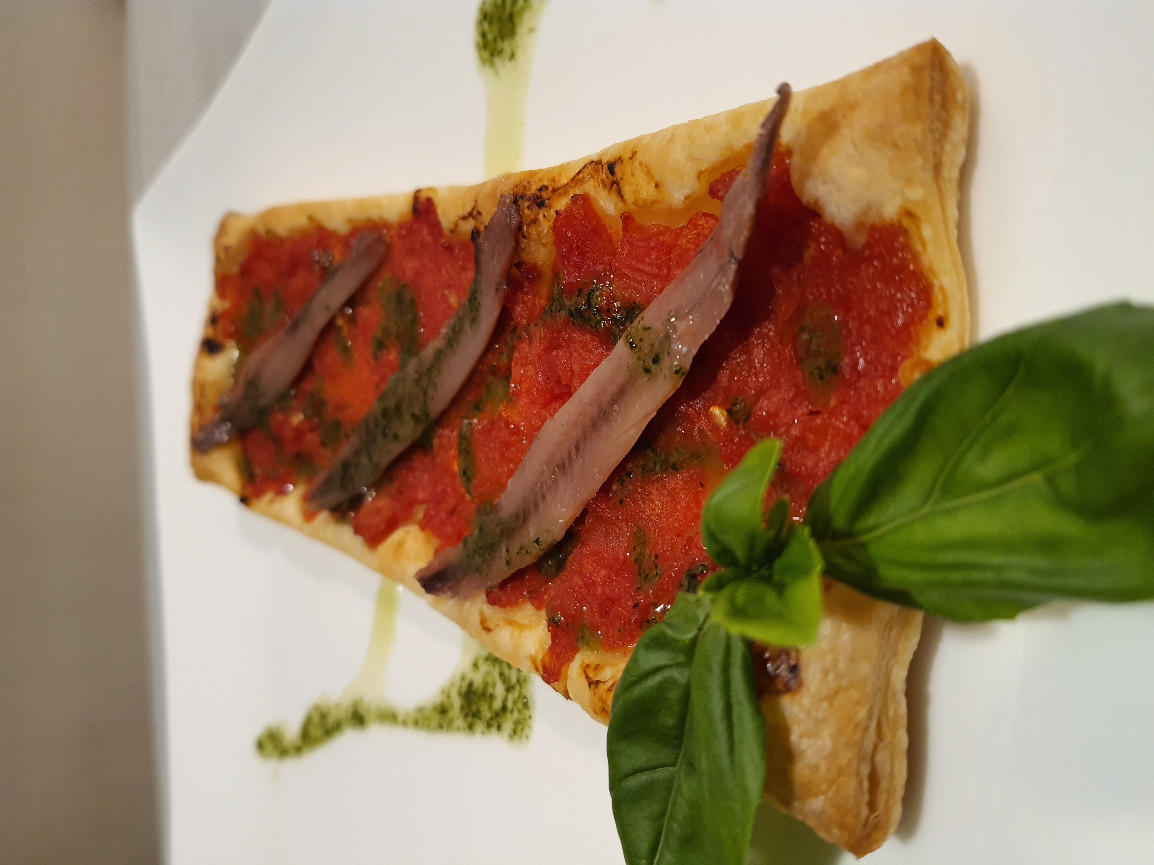 Galleta de hojaldre con tomate confitado, anchoas y culis de albahaca