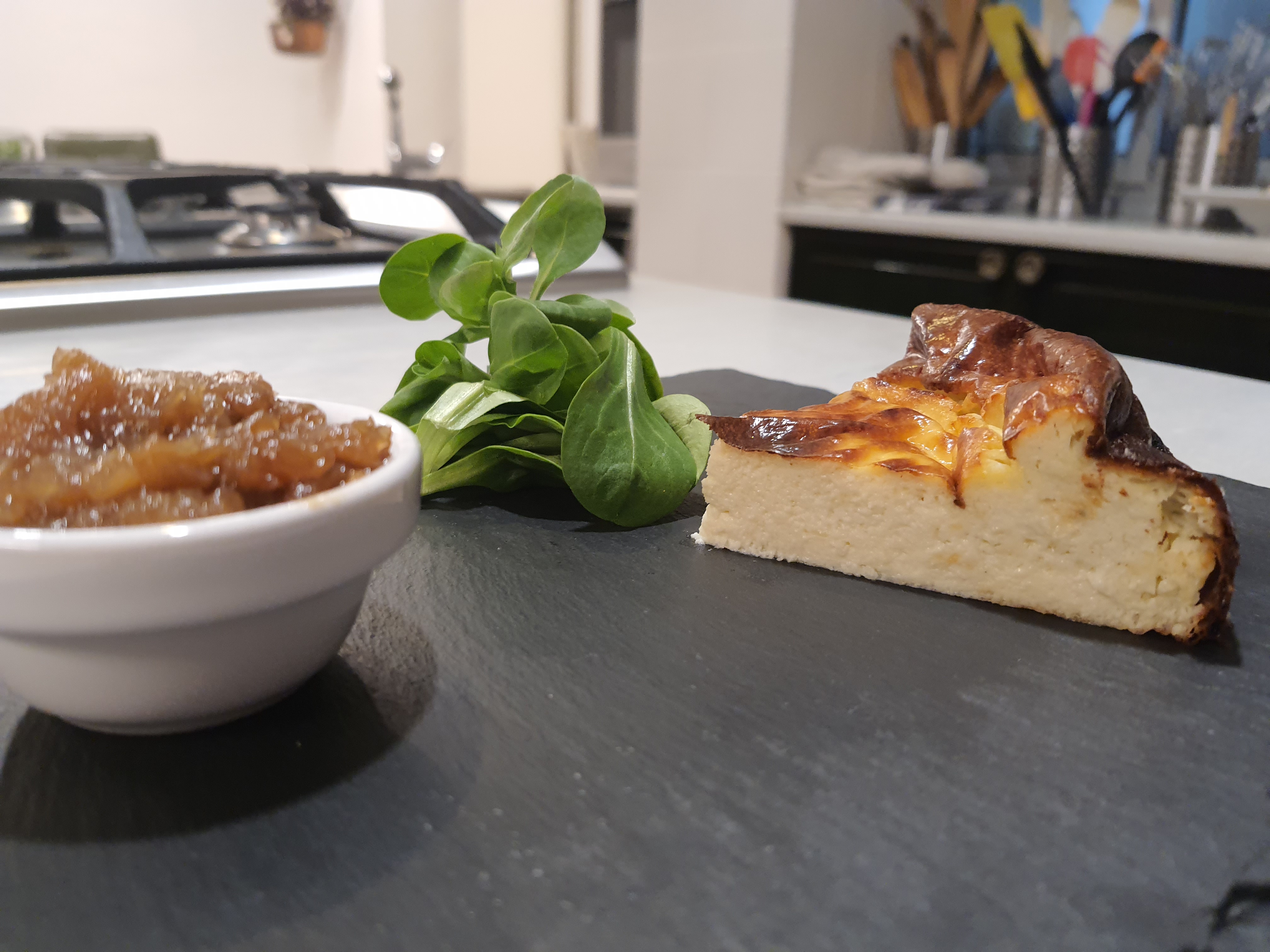Pastel de queso salado con confitura de cebolla