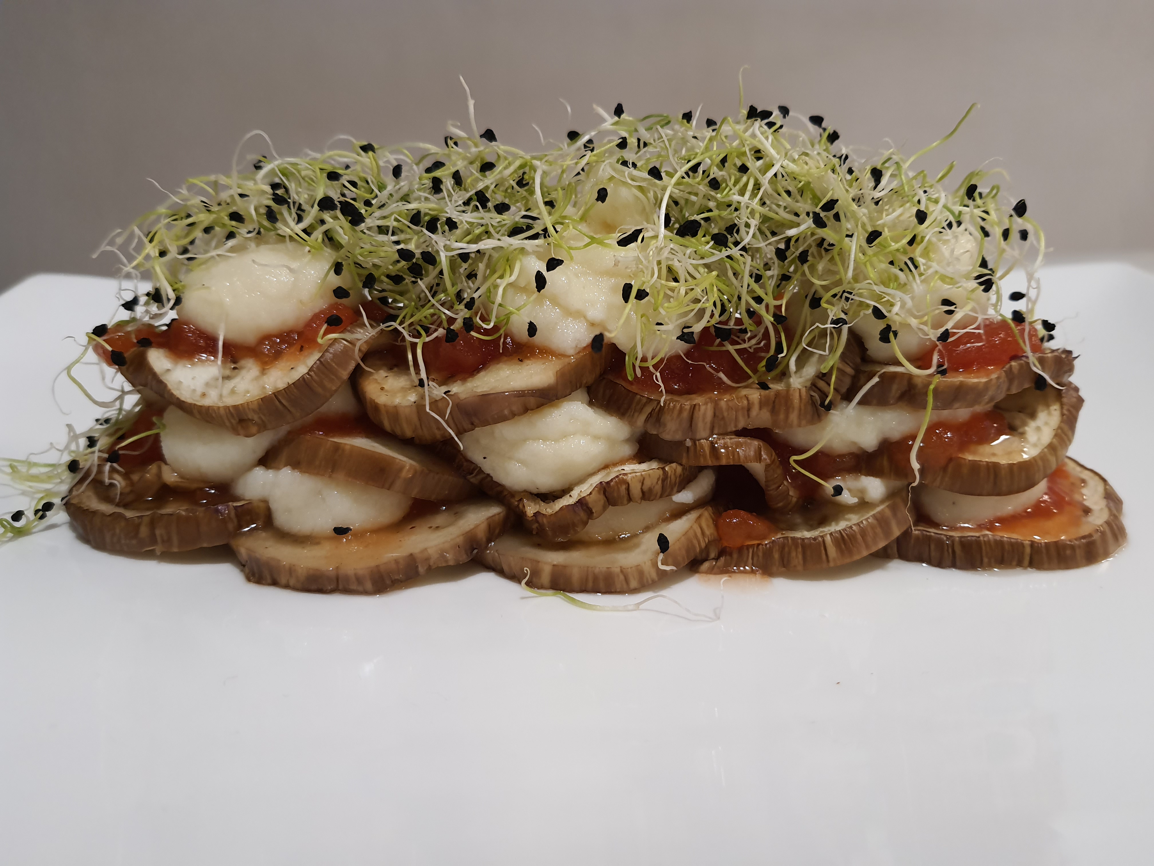 Milhojas de berenjena con brandada de bacalao