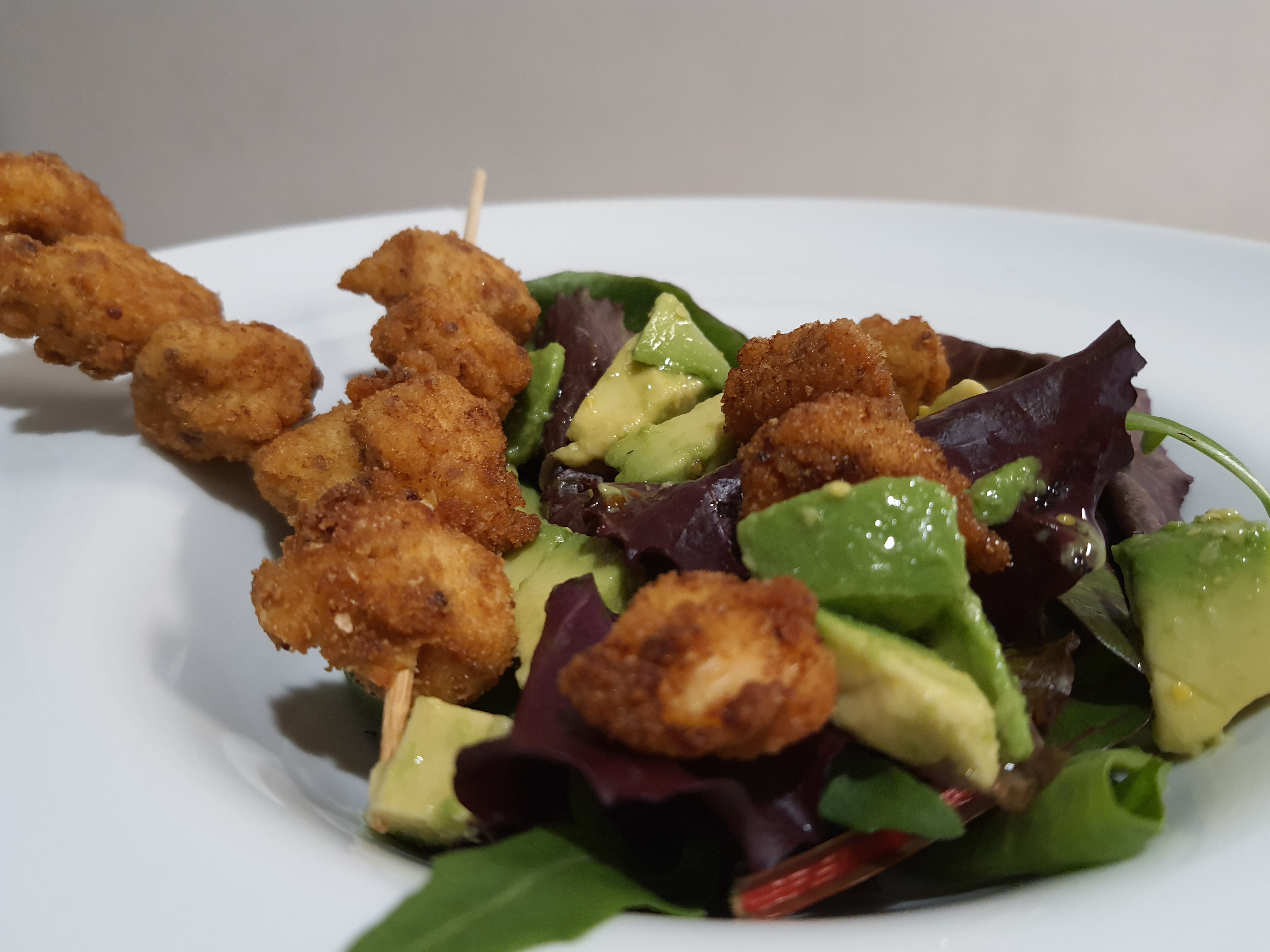 Ensalada de pollo crunchy con aguacate y vinagreta de mostaza