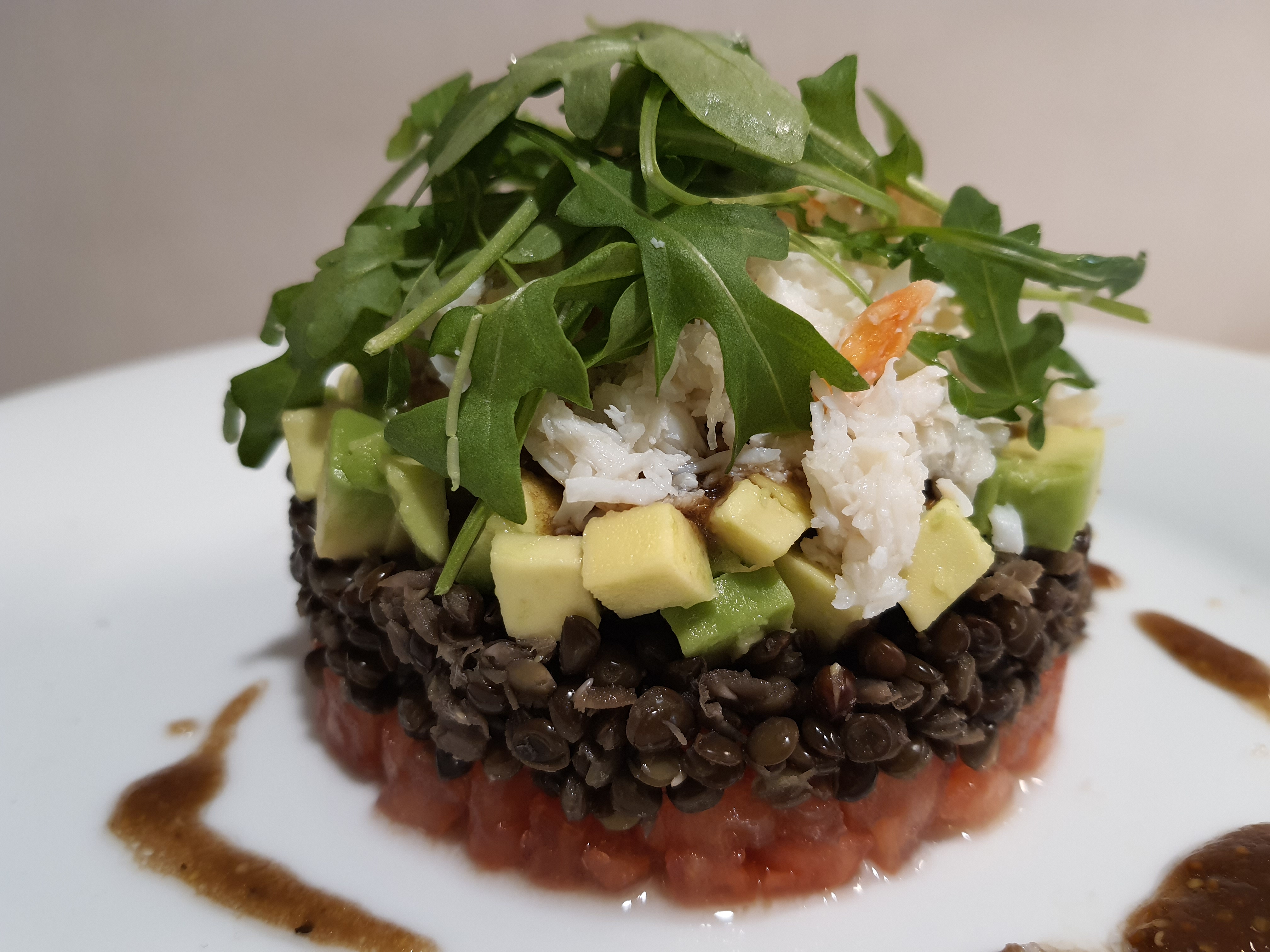 Ensalada de lentejas beluga con aguacate, cangrejo y vinagreta de mostaza antigua
