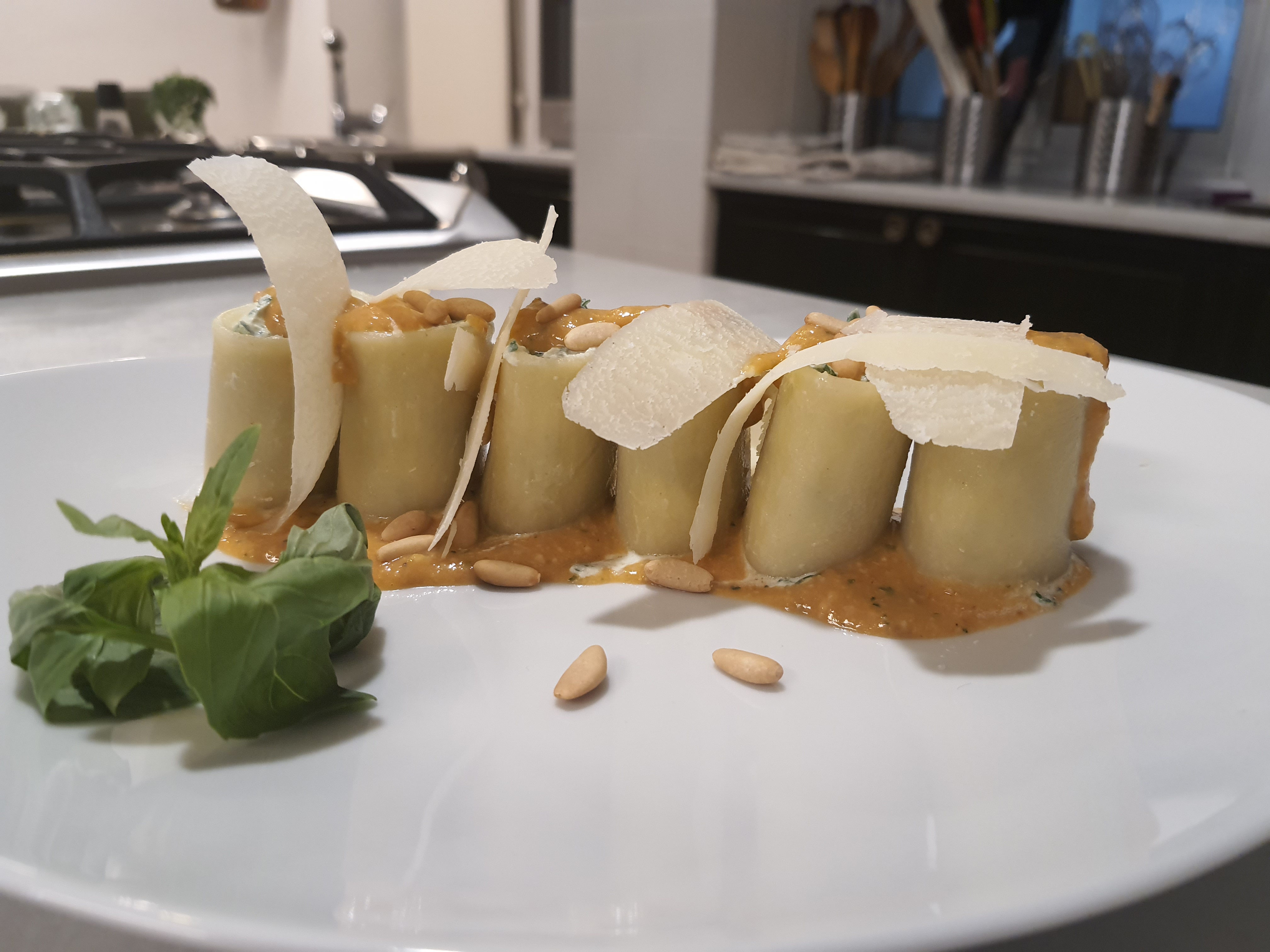 Paccheris rellenos de ricotta y espinacas con pesto rojo