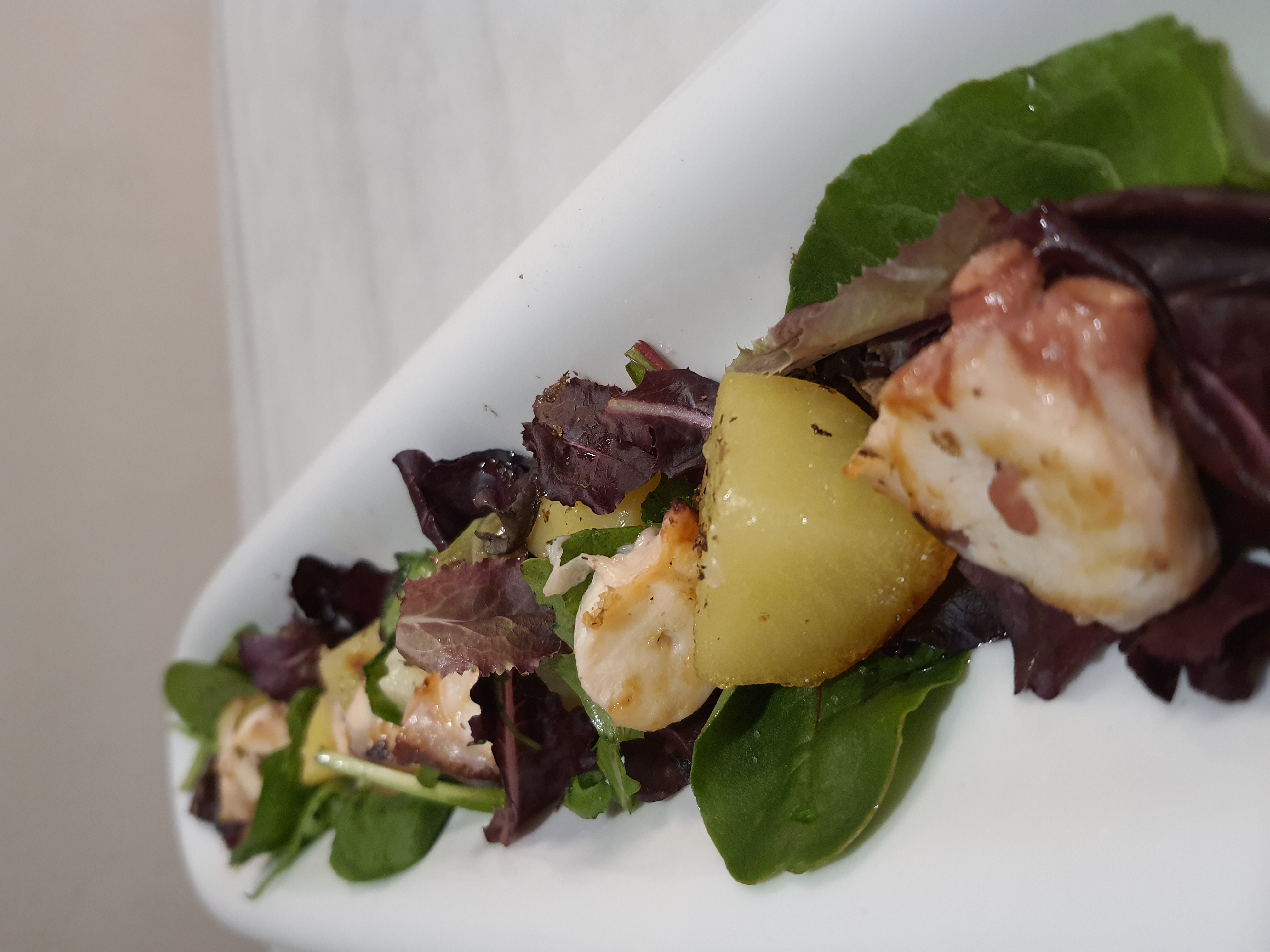 Vieira con vinagreta de mango, aceite de rúcula y su ensalada
