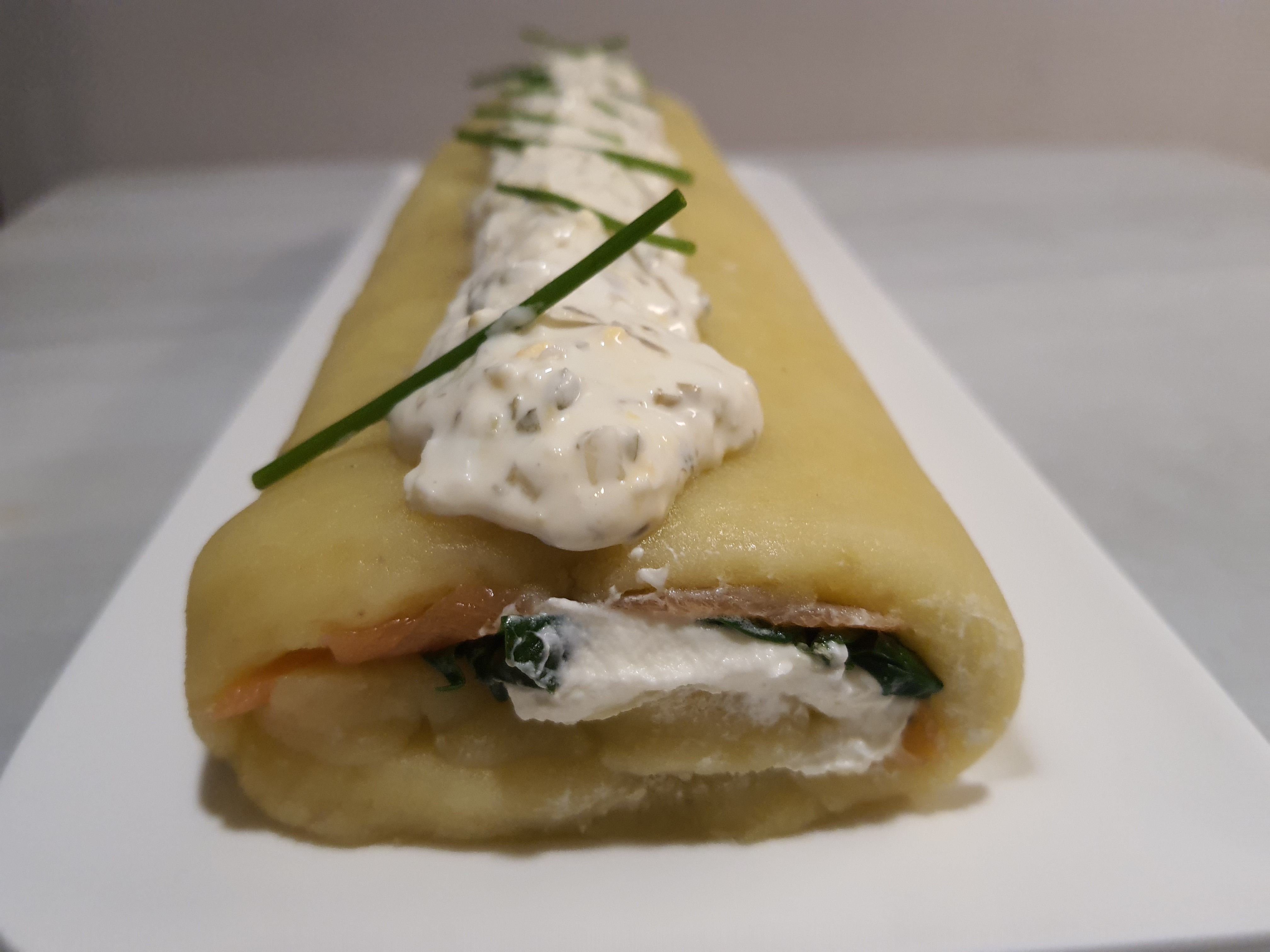 Tronco de patatas con espinacas, queso cremoso y salmón