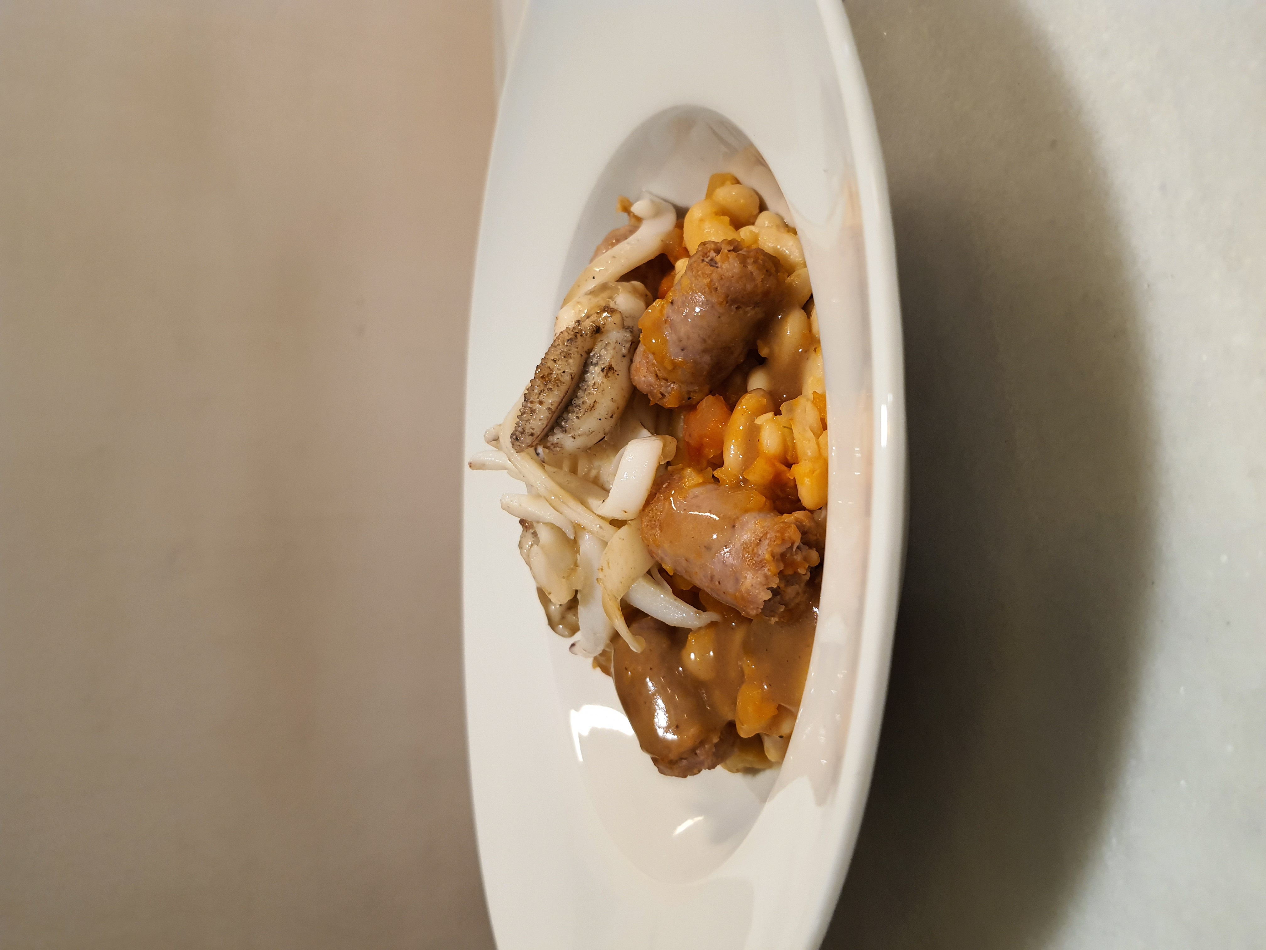 Judías del ganxet salteadas con sepia y salchichas