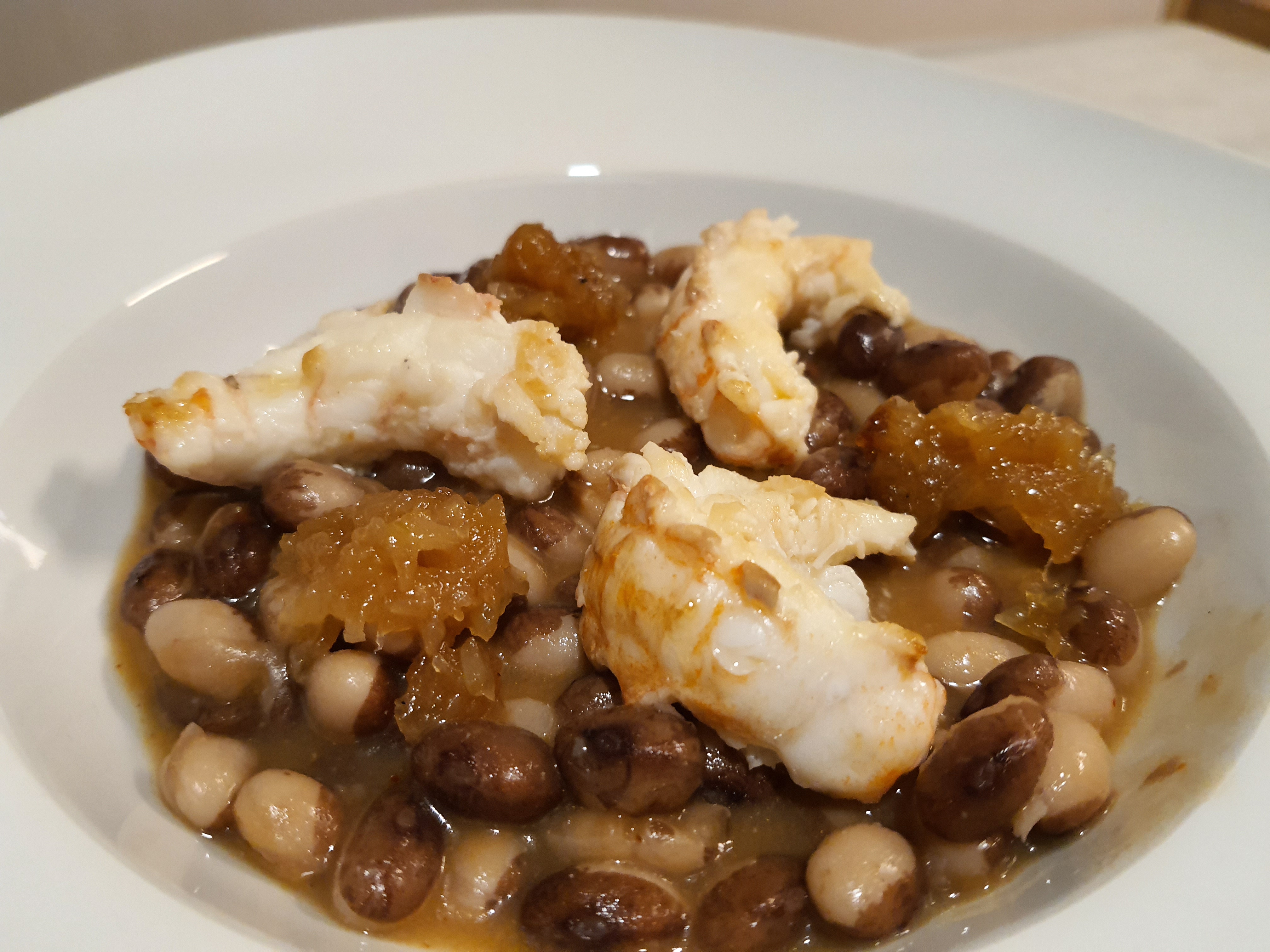 Guisadito de judías con cigalas y jugo de crustáceos
