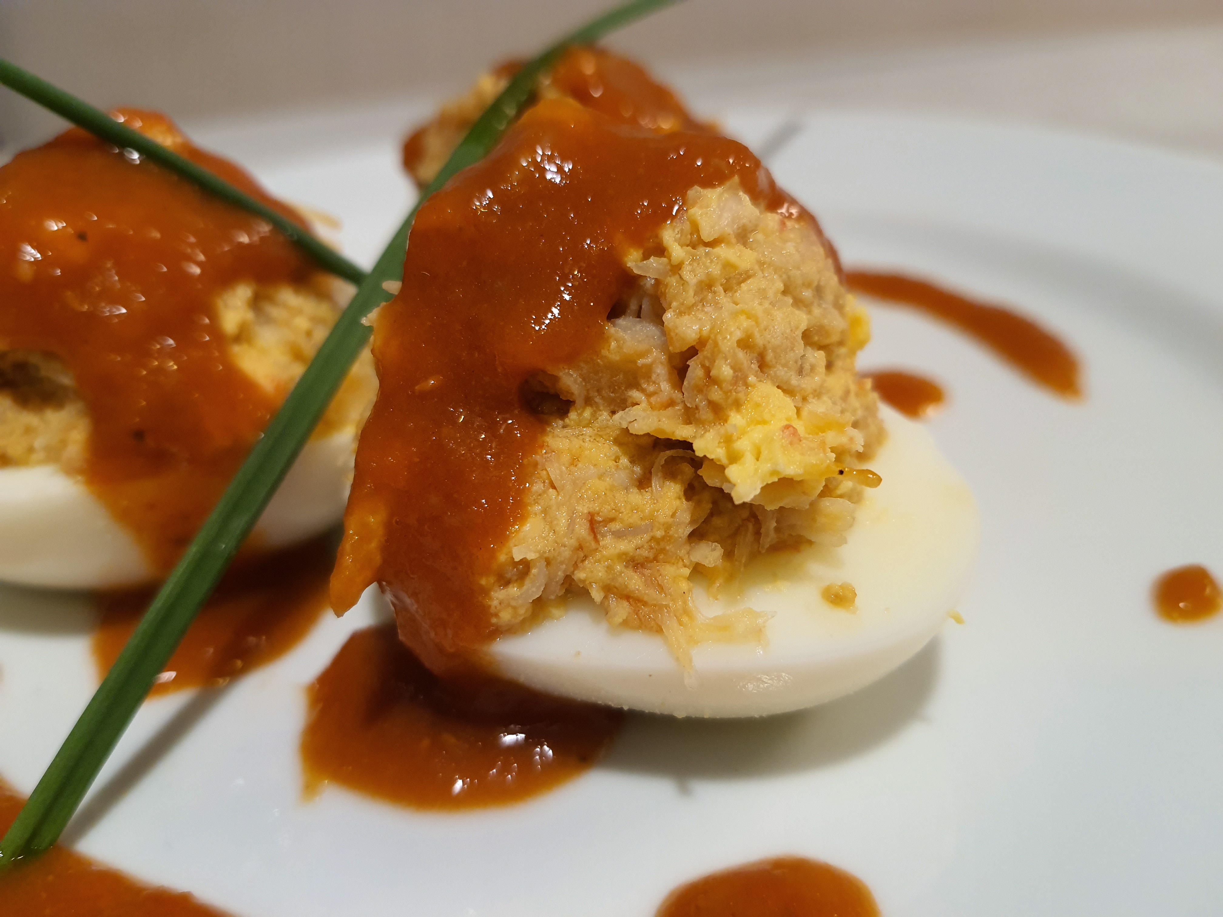 Huevos rellenos de txangurro con salsa de marisco
