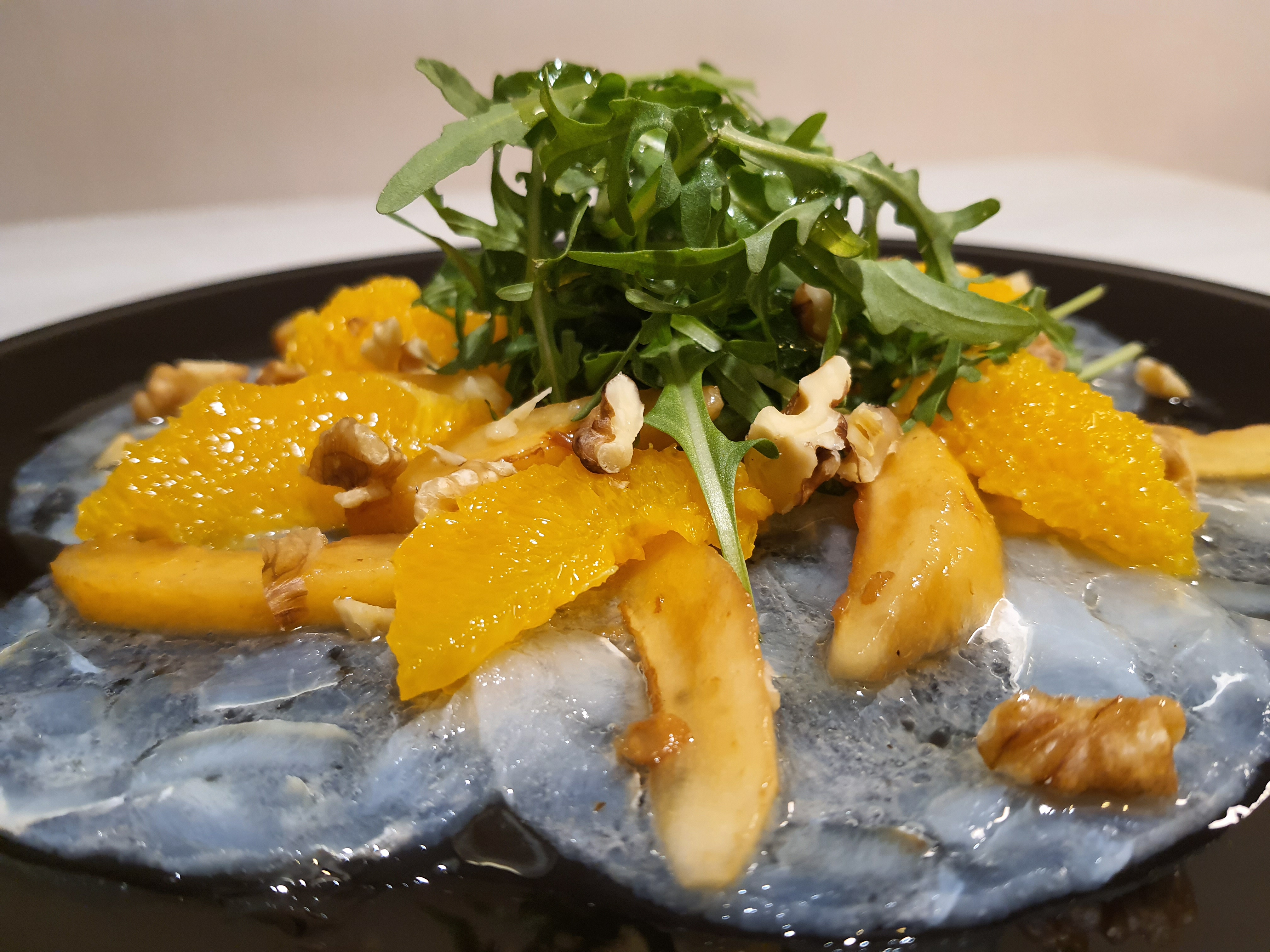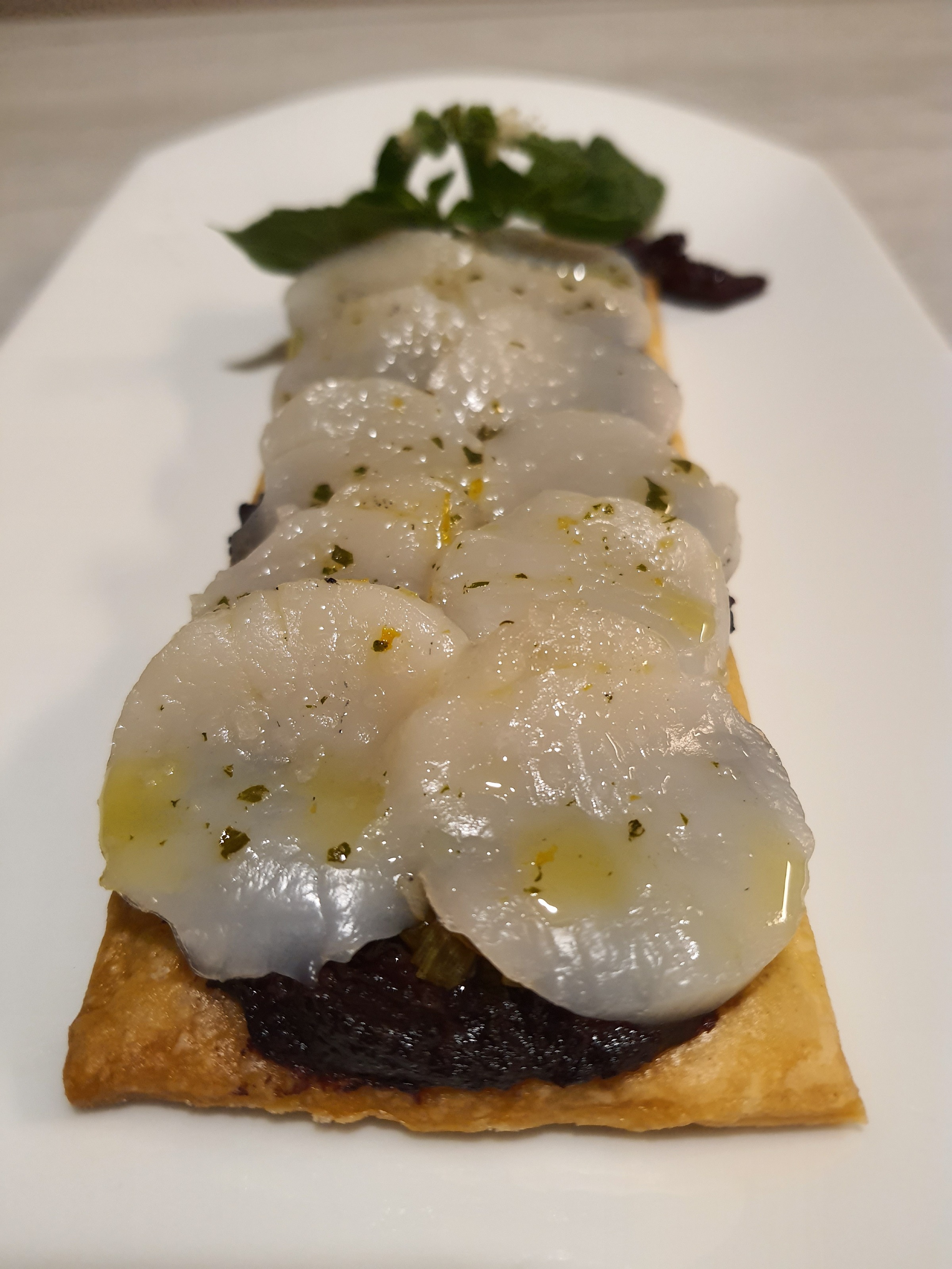 Coca de vieiras con tapenade y marinada de cítricos